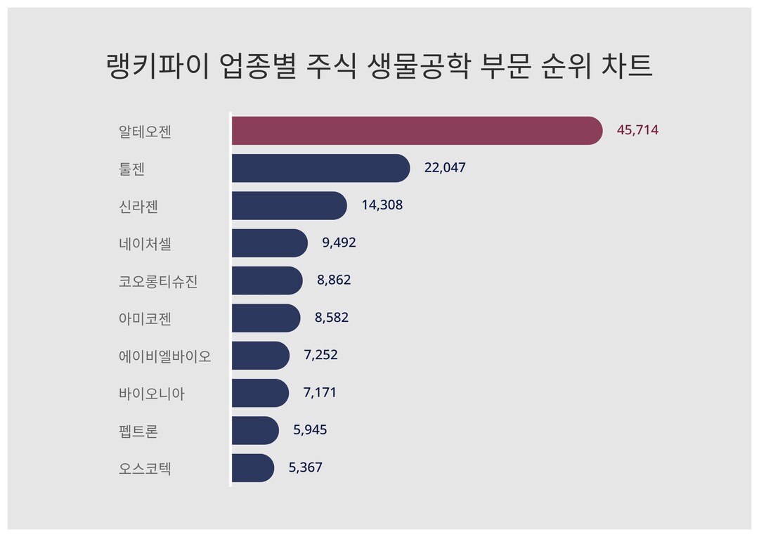 | 1 | 알테오젠 | 45,714 | 43,308 | 2,406 | 5.6% |