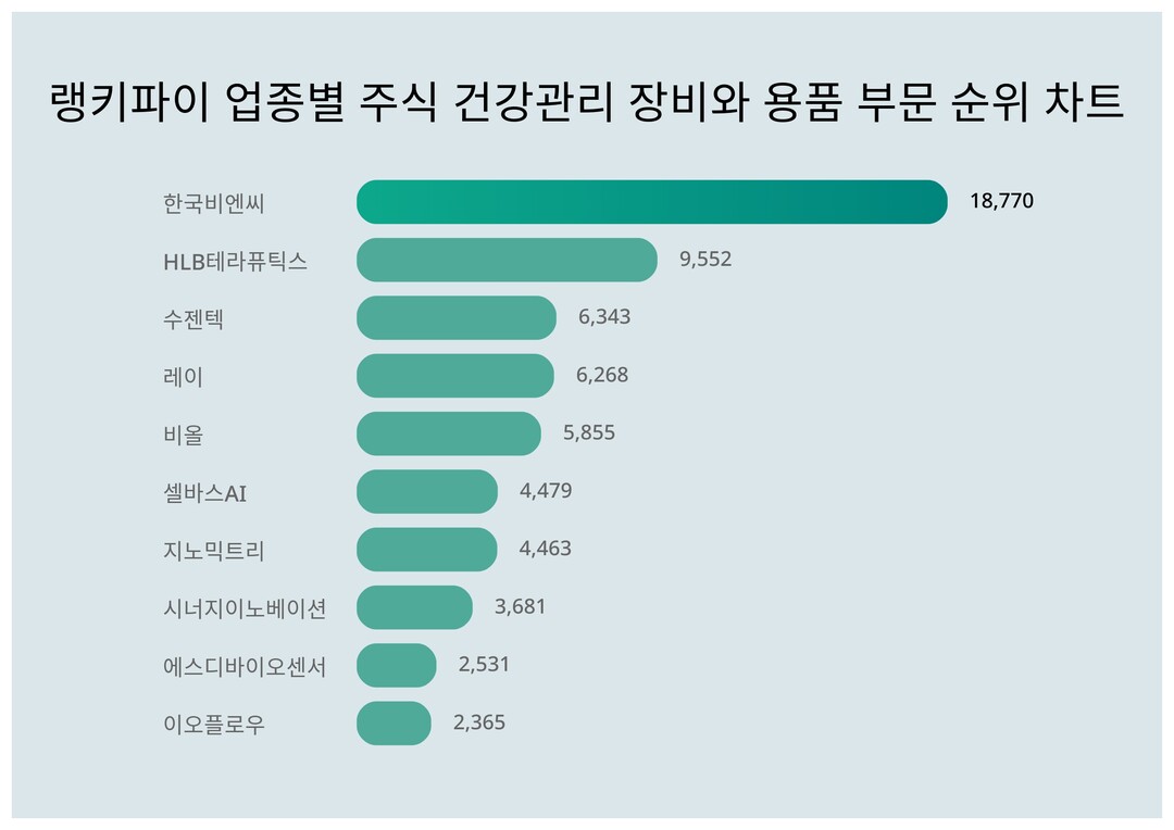 1위 한국비엔씨 주가·2위 HLB테라퓨틱스 주가·3위 수젠텍 주가, 3월 4주차 업종별 주식 건강관리 장비와 용품 부문 트렌드지수 순위 발표