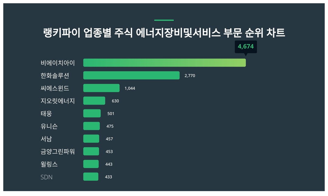 이어 11위 대명에너지 주가, 12위 에코바이오 주가, 13위 SGC에너지 주가, 14위 에스엘에너지 주가, 15위 제이씨케미칼 주가, 16위 HD현대에너지솔루션 주가, 17위 수산인더스트리 주가, 18위 오르비텍 주가, 19위 파루 주가, 20위 비디아이 주가로 나타났다.