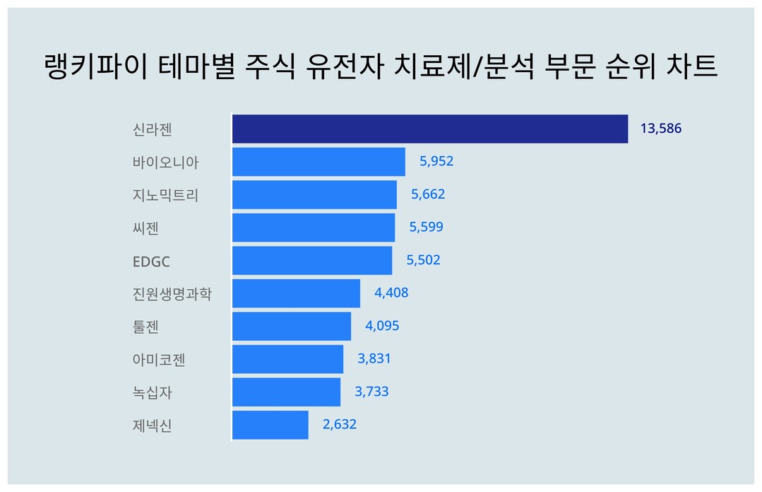 1위 신라젠 주가·2위 바이오니아 주가·3위 지노믹트리 주가, 4월 11일 랭키파이 테마별 주식 유전자 치료제/분석 부문 트렌드지수 순위 발표