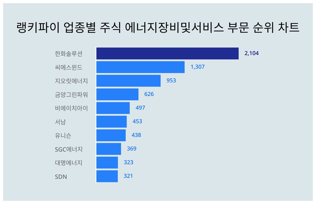 [CWN 김해남 기자] 랭키파이가 발표한 2024년 4월 9일 트렌드지수 분석 결과 업종별 주식 에너지장비및서비스 부문 트렌드지수에서 한화솔루션 주가가 1위를 차지했다.