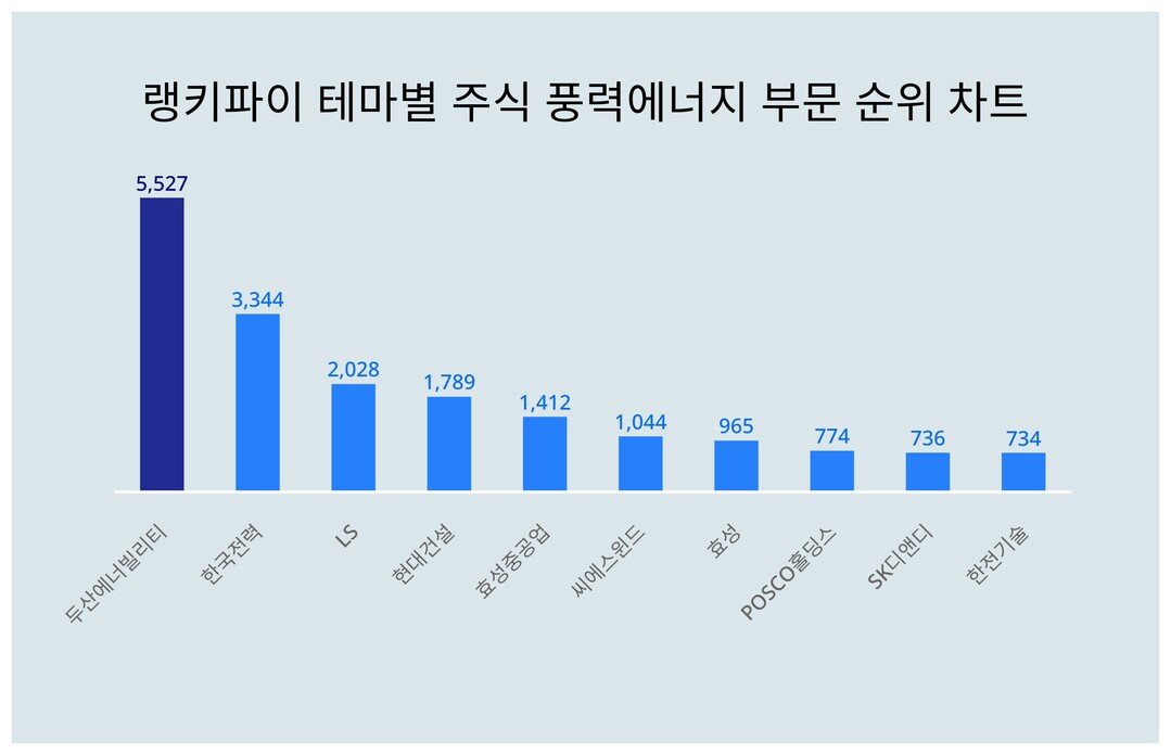[CWN 김해남 기자] 랭키파이가 발표한 2024년 4월 15일 트렌드지수 분석 결과 테마별 주식 풍력에너지 부문 트렌드지수에서 두산에너빌리티 주가가 1위를 차지했다.