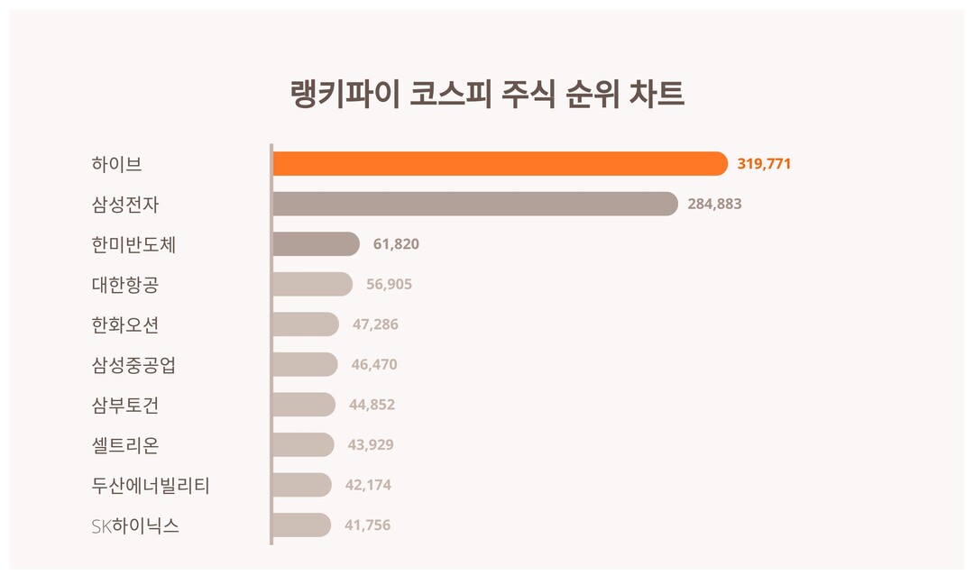 1위 하이브 주가는 트렌드지수 319,771점으로 전일 183,049점보다 136,722점 상승했다.