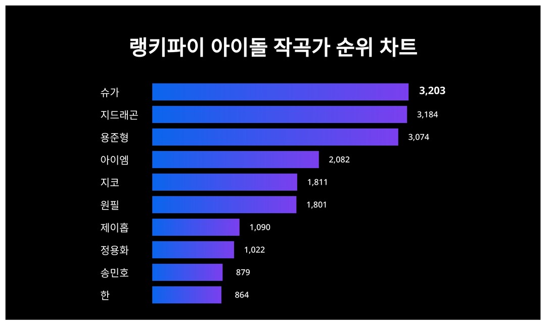 [CWN 김해남 기자] 랭키파이가 발표한 2024년 4월 2주차 아이돌 작곡가 트렌드 지수에서 슈가가 트렌드 지수 3,203포인트로 1위에 올랐다.