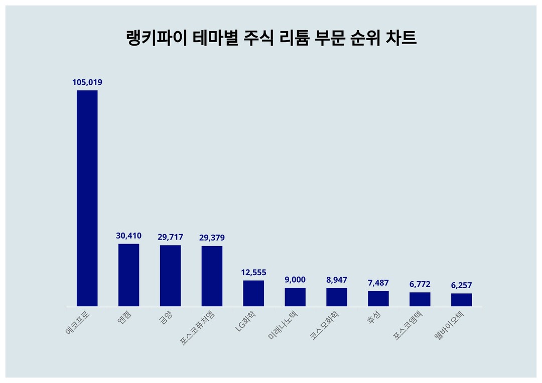 [CWN 김해남 기자] 랭키파이가 발표한 2024년 4월 11일 트렌드지수 분석 결과 테마별 주식 리튬 부문 트렌드지수에서 에코프로 주가가 1위를 차지했다.