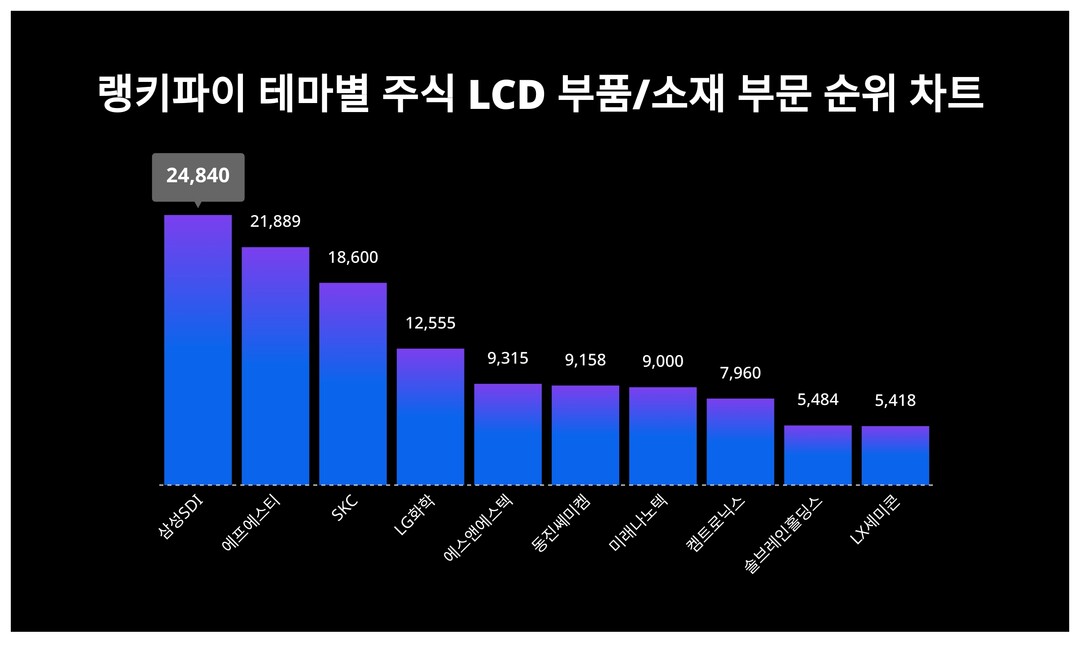 [CWN 김해남 기자] 랭키파이가 발표한 2024년 4월 11일 트렌드지수 분석 결과 테마별 주식 LCD 부품/소재 부문 트렌드지수에서 삼성SDI 주가가 1위를 차지했다.