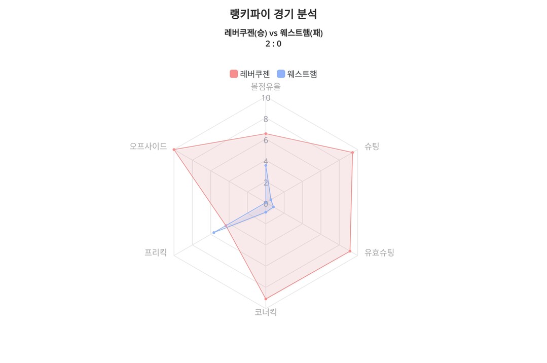'레버쿠젠 승리 '로 끝난 레버쿠젠 대 웨스트햄 경기 데이터, 랭키파이가 분석한 2023-24시즌 유로파리그 경기 데이터