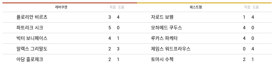 2023-24시즌 레버쿠젠과 웨스트햄 사이에서 공격 포인트로 주목받은 선수들의 기록을 아래 표에서 확인할 수 있다.