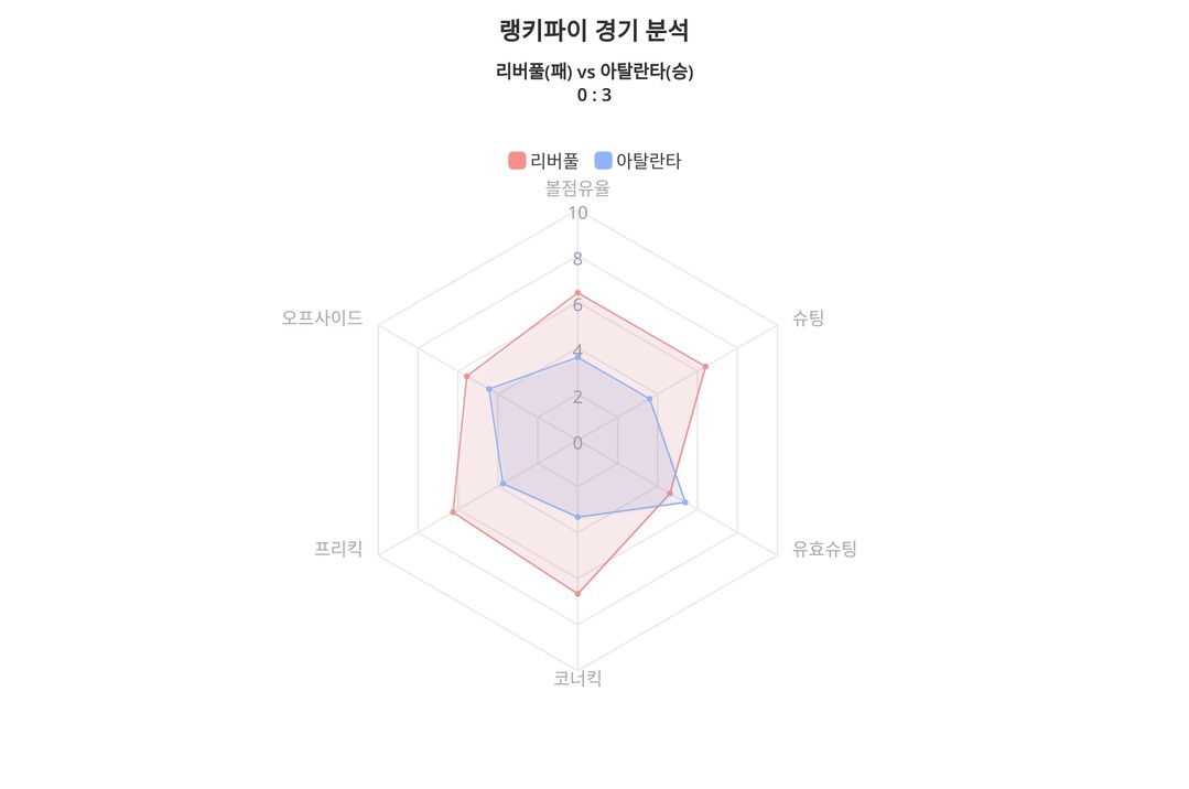 [CWN 김해남 기자] 2024년 4월 12일에 치뤄진 2023-24 유로파리그, 홈팀 리버풀이 어웨이팀 아탈란타를 안필드로 불러들여 치열한 공방 끝에 0:3 아탈란타가 승리했다. 경기 결과 데이터는 아래와 같다.