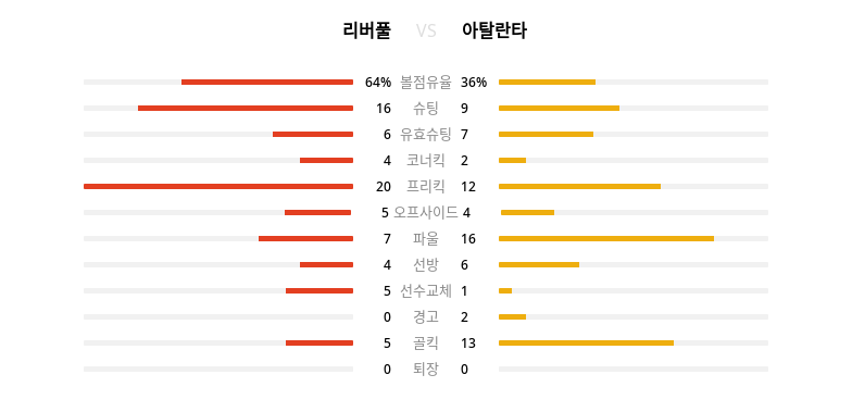 | 리버풀 | 득점 | 도움 | 슈팅 | 유효슈팅 | 패스 | 인터셉트 | 패스차단 | 태클 | 파울 | 걷어내기 | 경고 | 퇴장 |