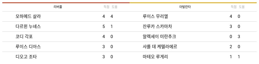 리버풀의 모하메드 살라는 득점 4, 도움 4를 기록하고 있으며, 다르윈 누녜스는 득점 5, 도움 1을 기록하였다.