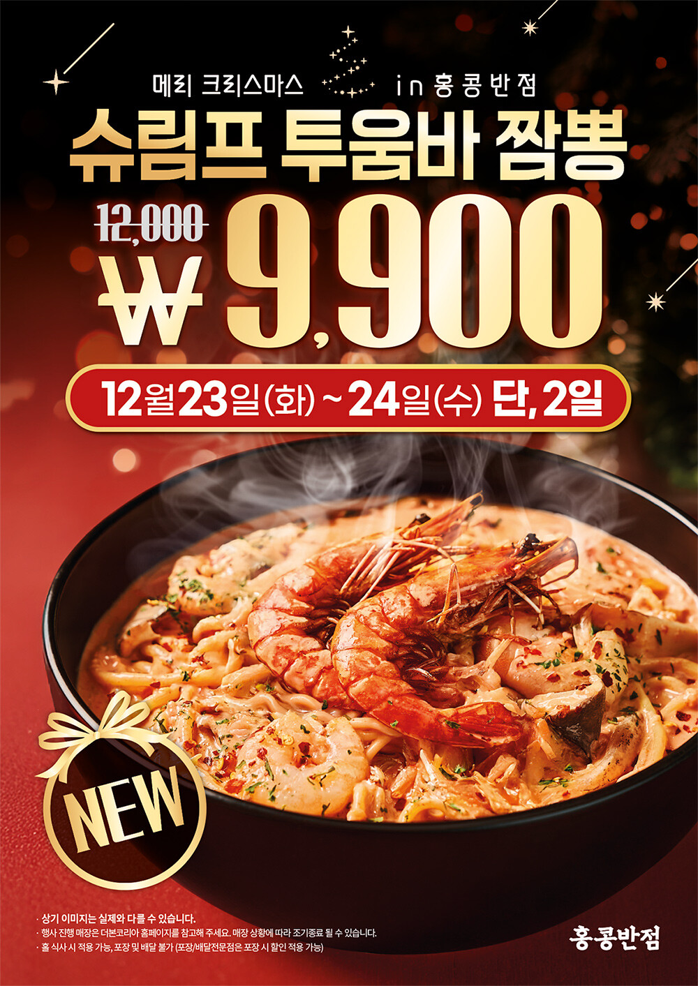홍콩반점은 신메뉴 출시를 기념해 할인 프로모션도 진행한다. 오는 12월 23일부터 24일까지 이틀간 매장 식사 고객을 대상으로 ‘슈림프 투움바 짬뽕’을 9,900원에 판매한다. 해당 메뉴의 정가는 1만2,000원이다.