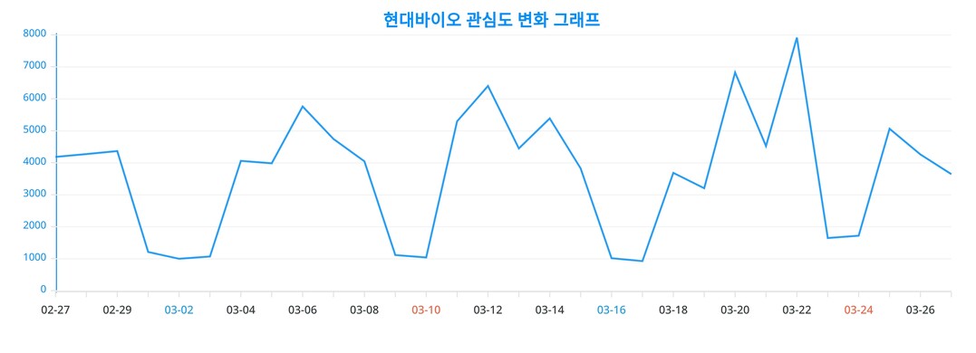 이 차트는 현대바이오의 시간에 따른 인기 변동성을 직관적으로 이해할 수 있는 지표이다.