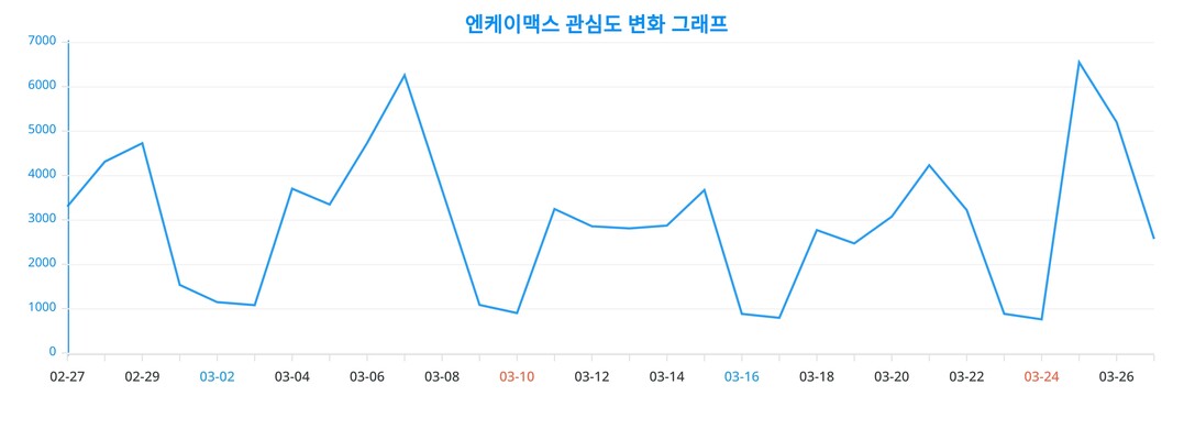 또한, 엔케이맥스에 대한 일간 변화 추이를 보여주는 차트는 엔케이맥스에 대한 관심이 어떻게 변화하고 있는지를 상세하게 보여준다.