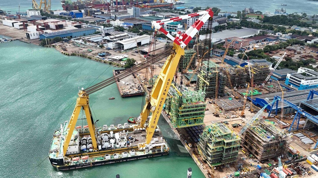 ▲다이나맥이 제조한 해상플랜트가 상부 구조물을 옮기는 모습. 사진=다이나맥 홈페이지