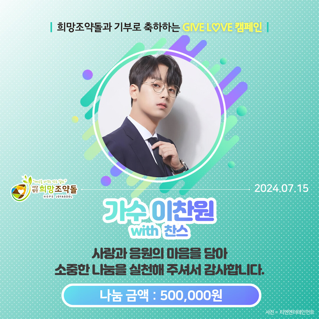 희망조약돌 이재원 사무총장은 “국내 취약계층 아동·청소년을 위한 이찬원 팬분들의 따뜻한 나눔에 감사드린다. 희망조약돌은 앞으로도 팬덤 기부, 팬 기부 독려를 통해 아름다운 팬 기부 문화 확산에 이바지하며 국내 구호활동에 최선을 다하겠다”고 전했다.