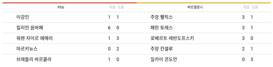 2023-24시즌 PSG와 바르셀로나 사이에서 공격 포인트로 주목받은 선수들의 기록을 아래 표에서 확인할 수 있다.