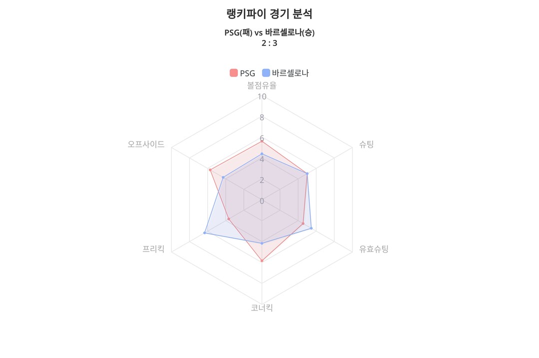 [CWN 김해남 기자] 2024년 4월 11일 오전 4시(한국시간)에 치뤄진 2023-24 챔피언스리그, 홈팀 PSG가 어웨이팀 바르셀로나를 파르크 데 프랭스로 불러들여 치열한 공방 끝에 2:3 바르셀로나가 승리했다. 경기 결과 데이터는 아래와 같다.