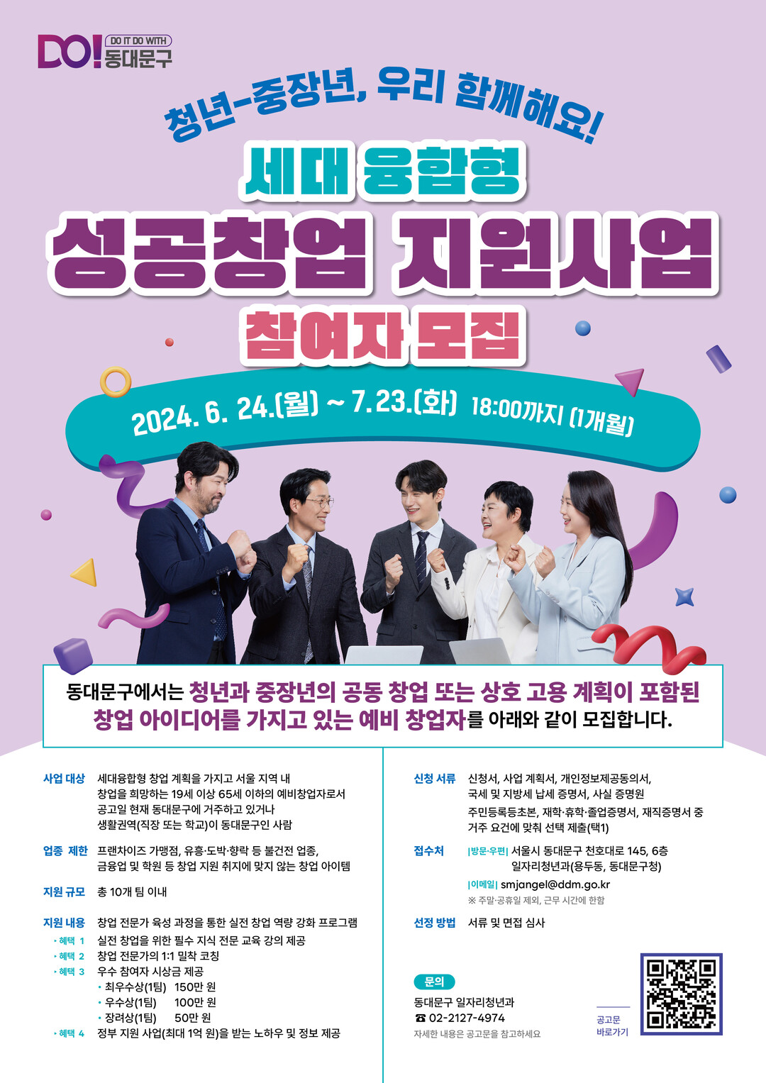 이필형 동대문구청장은 “청년층과 중장년층이 어우러져 구성된 ‘세대 융합형 창업팀’이 만들어 낼 시너지가 기대된다”며 “앞으로도 창업과 취업을 포함한 양질의 일자리 창출 사업을 지속 발굴·지원하겠다”고 말했다.