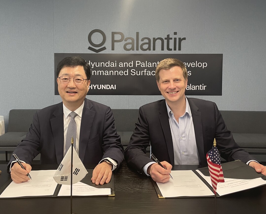 15일 업계에 따르면 HD현대는 최근 미국 워싱턴 D.C.의 팔란티어 사무실에서 '무인수상정 개발을 위한 양해각서(MOU)'를 체결했다. 체결식에는 주원호 HD현대중공업 특수선사업대표 부사장, 라이언 테일러 팔란티어 글로벌 영업대표(CRO) 및 최고법무책임자(CLO)가 참석했다.