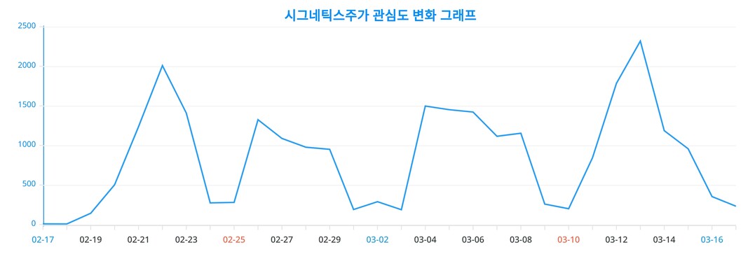 이 차트는 시그네틱스주가의 시간에 따른 인기 변동성을 직관적으로 이해할 수 있는 지표이다.