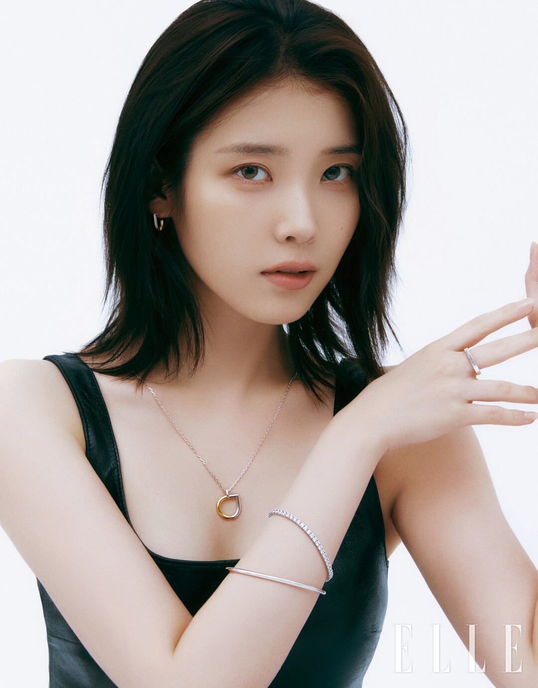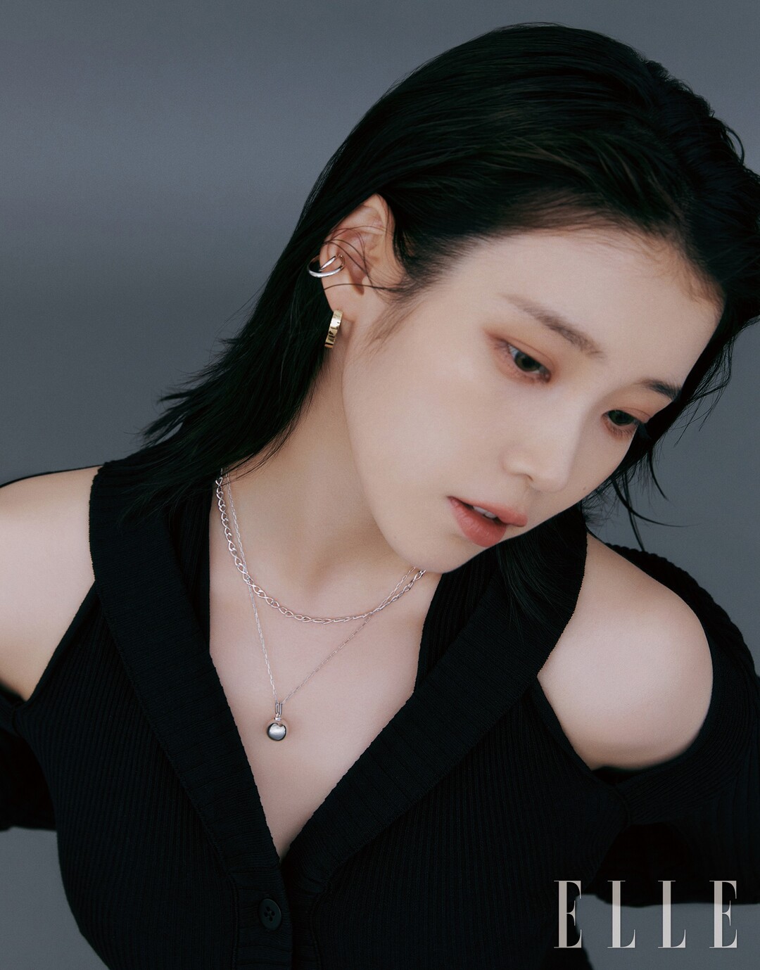 다른 컷에서 아이유는 깊은 넥 라인의 블랙 드레스에 실버 주얼리를 레이어드 매치해 우아한 룩을 완성했다.