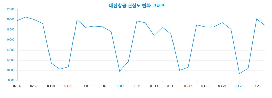 이 차트는 대한항공의 시간에 따른 인기 변동성을 직관적으로 이해할 수 있는 지표이다.