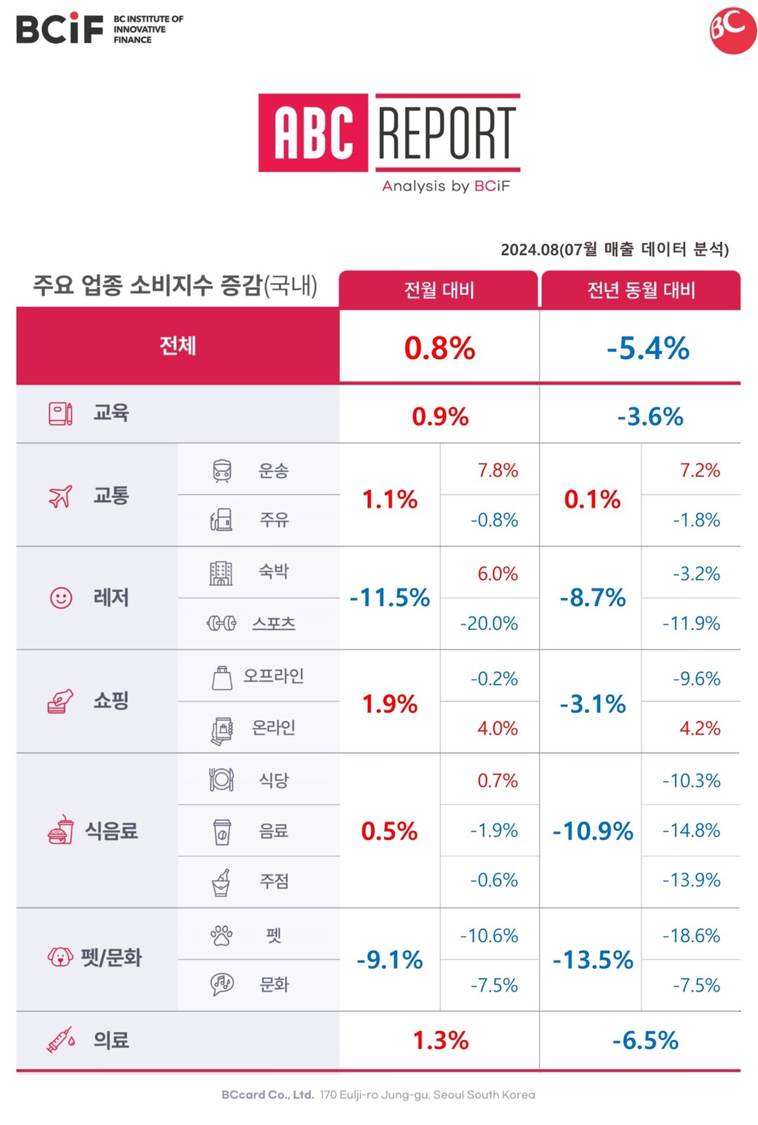 리포트에 따르면 올해 7월 국내 주요 업종 매출은 전년 동월 대비 5.4% 감소했다. 전월 대비로는 소폭 증가했는데, 여행과 관련된 운송(7.8%↑), 숙박(6.0%↑)과 더불어 온라인 쇼핑, 의료, 교육 업종 소비 증가세의 영향으로 분석된다.