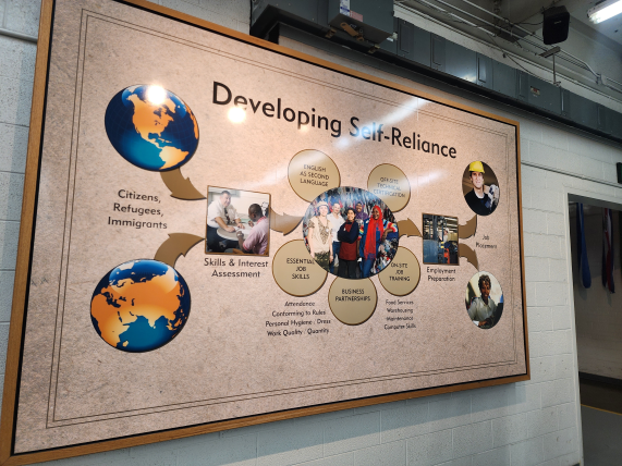 "Cleaning Kit"라 적힌 흰 통에는 재난 현장에서 필요한 수건, 세제, 위생용품이 들어 있었고, 통 표면에는 "예수 그리스도 후기성도 교회가 드리는 선물"이라는 문구가 적혀 있었다. 포교적 강요 없이 투명하게 출처를 밝히는 태도다. 벽면에는 "자립(Self-Reliance)" 안내판이 붙어 있었는데, 영어 교육, 직업훈련, 취업 알선 등 난민의 정착을 돕는 프로그램이 단계별로 마련되어 있었고, 봉사활동에 참여하면 급여를 받는 제도도 있었다. 이는 구호를 넘어 상호적 존엄의 실현이자, 유엔난민기구(UNHCR)가 강조하는 '지속가능한 정착' 접근과 맥을 같이 한다.