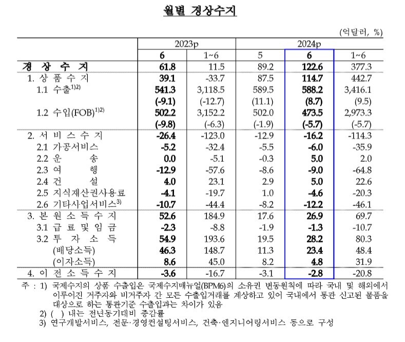 한국은행이 7일 발표한 국제수지 잠정통계에 따르면 지난 6월 경상수지는 122억6000만달러(약 16조8900억원) 흑자로 집계됐다.