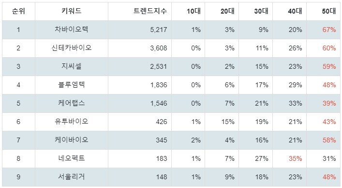 연령별 선호도에서 차바이오텍 주가는 10대 1%, 20대 3%, 30대 9%, 40대 20%, 50대 67%로 나타났다.