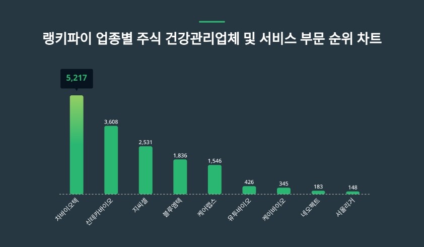 | ▲랭키파이 업종별 주식 건강관리업체 및 서비스 부문 트렌드 테이블 |