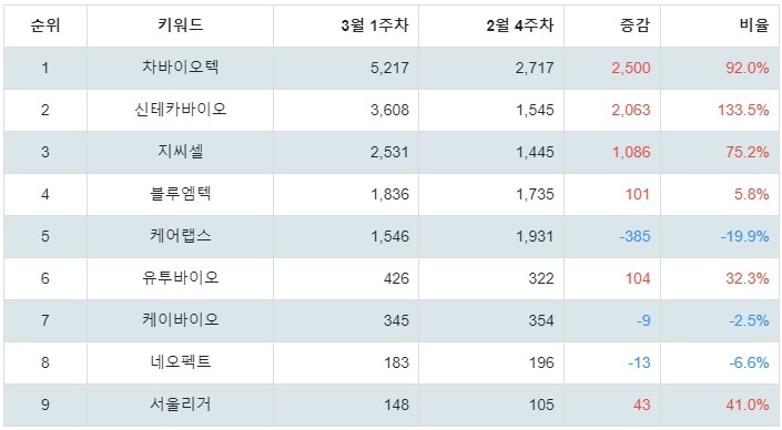 1위 차바이오텍 주가는 트렌드지수 5,217점으로 전주 2,717점보다 2,500점 상승했다.