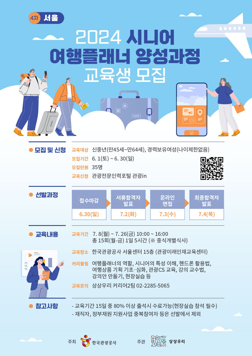 교육 내용은 △여행플래너의 역할 △시니어의 특성 이해 △휴대전화 활용법 △여행상품 기획 △강의 교수법 △강의안 만들기 등으로 구성하고 현장 실습도 병행한다.