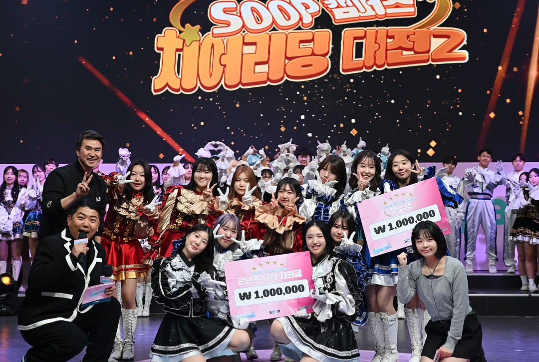 가톨릭대학교(화랑)가 지난 29일 오후 서울 송파구 롯데월드 'DN 콜로세움'에서 열린 'SOOP 캠퍼스 치어리딩 대전 2'에서 우수상을 수상, 최영우 SOOP 대표이사와 진행을 맡은 최군형-김순지와 함께 포즈를 취하고 있다.