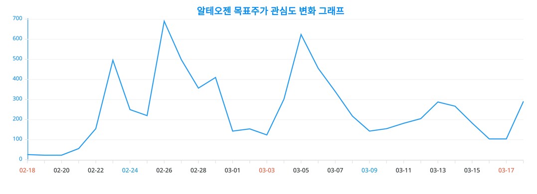 이 차트는 시간에 따른 알테오젠 목표주가의 인기 변동성을 직관적으로 나태내고 있다.