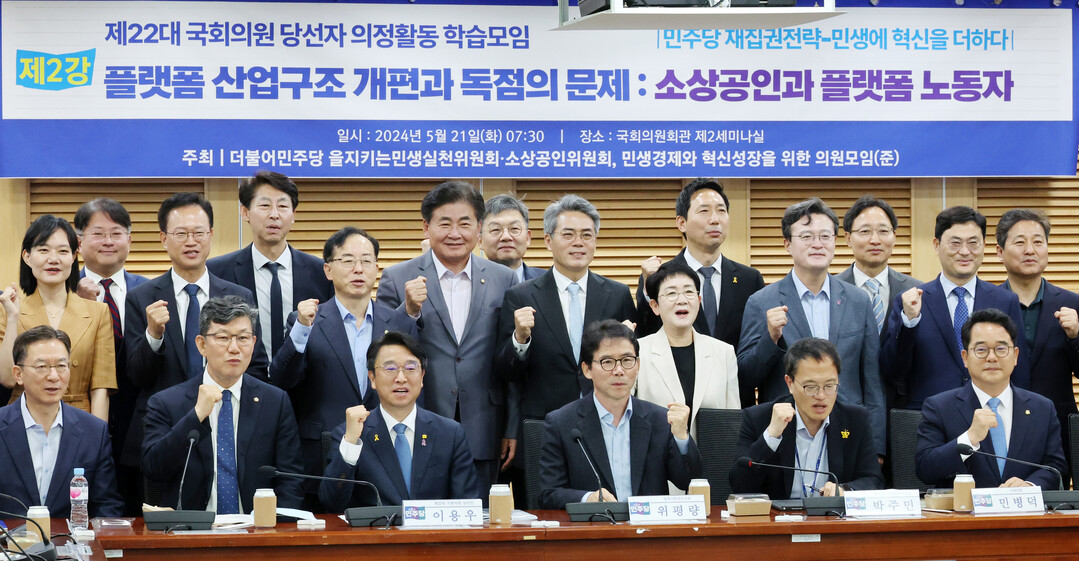 | ▲박주민(앞줄 오른쪽 두 번째) 더불어민주당 을지로위원장과 제22대 국회 당선인들이 21일 오전 서울 여의도 국회 의원회관에서 플랫폼 산업구조 개편과 독점의 문제 : 소상공인과 플랫폼 노동자를 주제로 열린 더불어민주당 제22대 국회의원 당선자 의정활동 학습모임에서 기념촬영을 하고 있다. 사진=뉴시스 |
