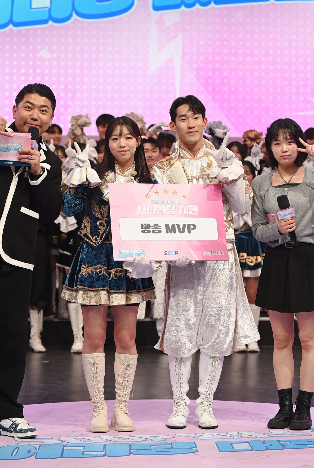 숭실대학교(Winni)가 지난 29일 오후 서울 송파구 롯데월드 'DN 콜로세움'에서 열린 'SOOP 캠퍼스 치어리딩 대전 2'에서 '방송 MVP상'을 수상, 진행을 맡은 최군형-김순지와 함께 포즈를 취하고 있다.
