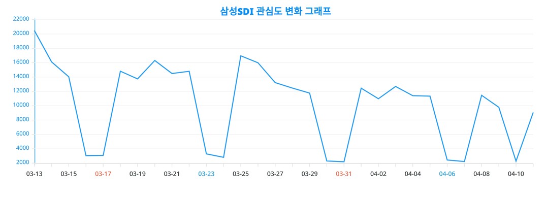 이번 분석을 통해 얻어진 삼성SDI에 대한 일간 변화 추이 차트는, 삼성SDI에 대한 관심이 어떻게 변화했는지를 생생하게 드러낸다.
