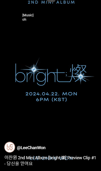 이찬원의 두 번째 미니앨범 ‘bright;燦’은 오는 4월 22일 오후 6시 각종 음원사이트를 통해 앨범을 발매된다.