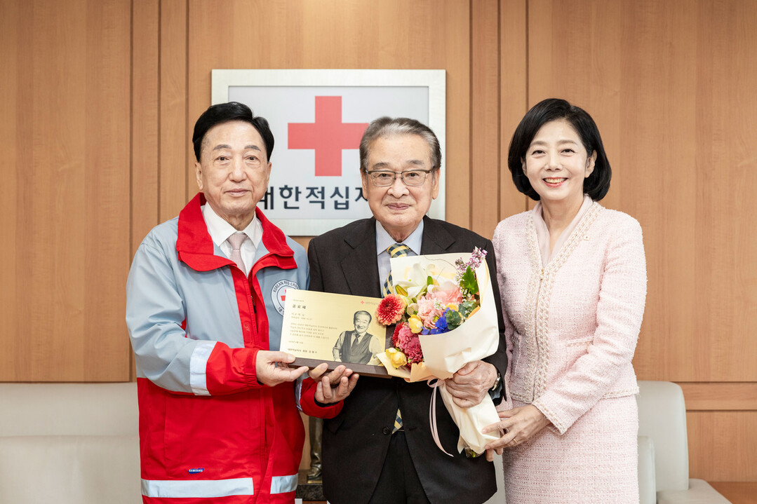 | ▲16일(화) 11시, 서울 중구 대한적십자사 서울사무소에서 이순재 친선대사의 공로패 전달식이 진행되었다. (사진 왼쪽부터 김철수 대한적십자사 회장, 이순재 친선대사, 정채영 부회장).사진=대한적십자사 |