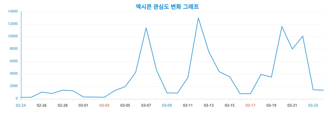 이번 분석을 통해 얻어진 엑시콘에 대한 일간 변화 추이 차트는, 엑시콘에 대한 관심이 어떻게 변화했는지를 생생하게 드러낸다.