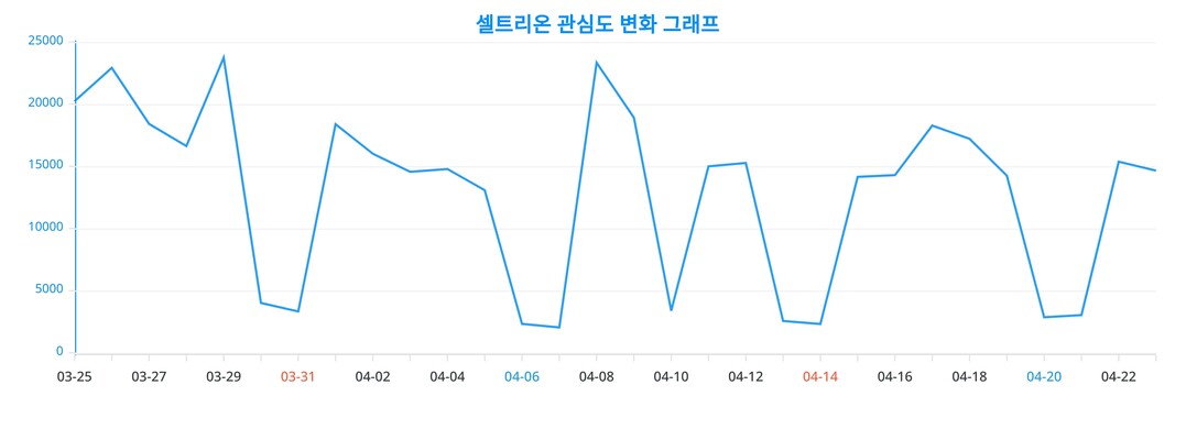 이번 분석을 통해 얻어진 셀트리온에 대한 일간 변화 추이 차트는, 셀트리온에 대한 관심이 어떻게 변화했는지를 보여준다.