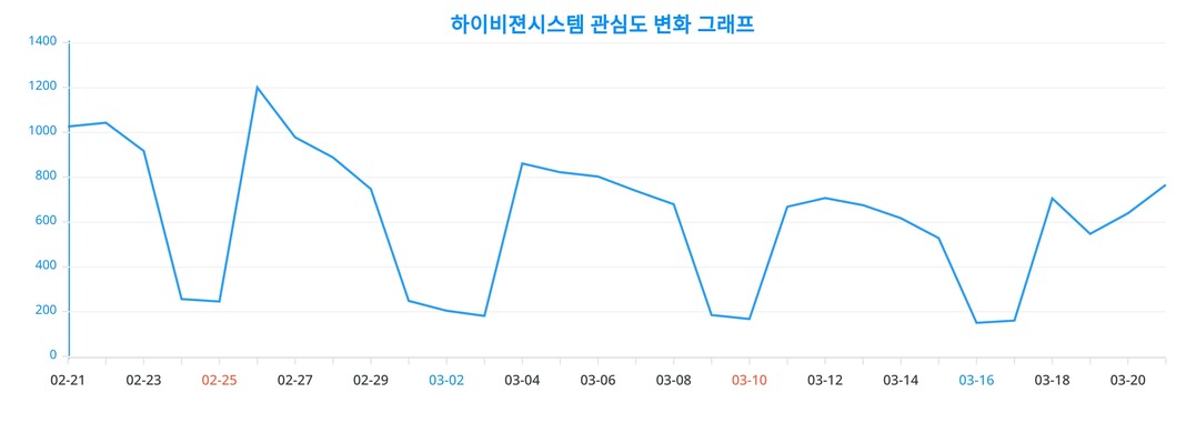 이번 분석을 통해 얻어진 하이비젼시스템에 대한 일간 변화 추이 차트는, 하이비젼시스템에 대한 관심이 어떻게 변화했는지를 생생하게 드러낸다.