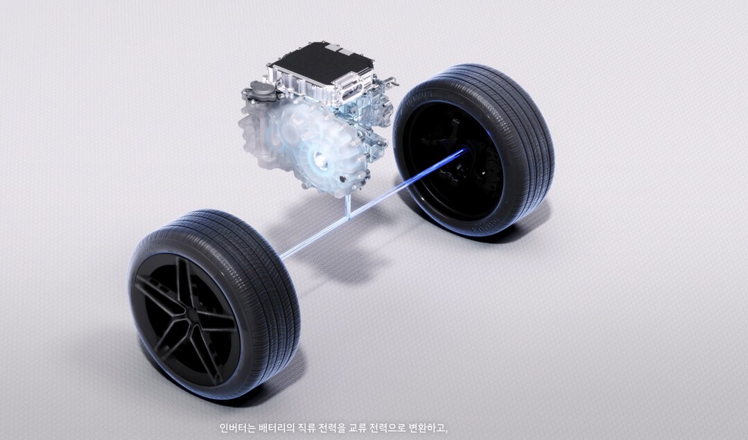 영상은 기본적인 모터 구동 시스템의 3가지 주요 부품을 소개하는 것으로 시작한다. 모터는 회전력을 생성하고, 감속기는 그 회전력을 바퀴에 전달한다. 인버터는 배터리의 직류 전력을 교류로 변환하는 역할을 담당한다.