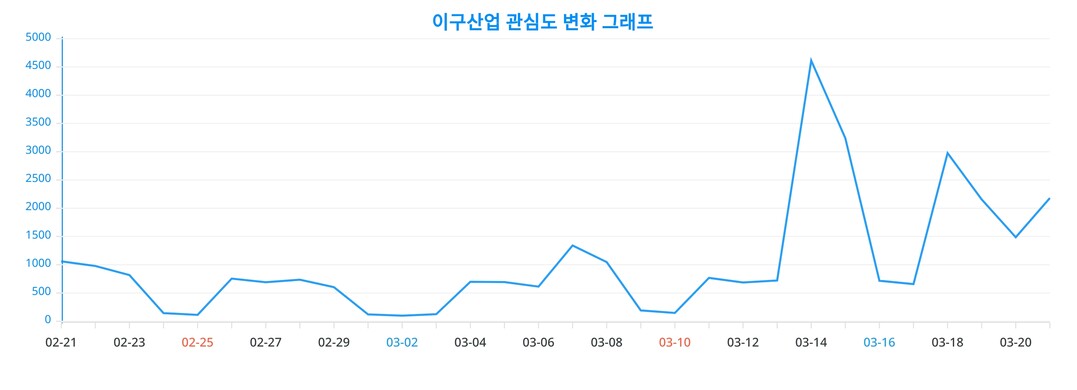 특히, 이구산업에 대한 성별 관심도 조사 결과, 남자가 73%의 비율로 더 높은 관심을 보이는 것으로 나타나, 이 인기 키워드에 대한 성별 편차를 드러냈다.