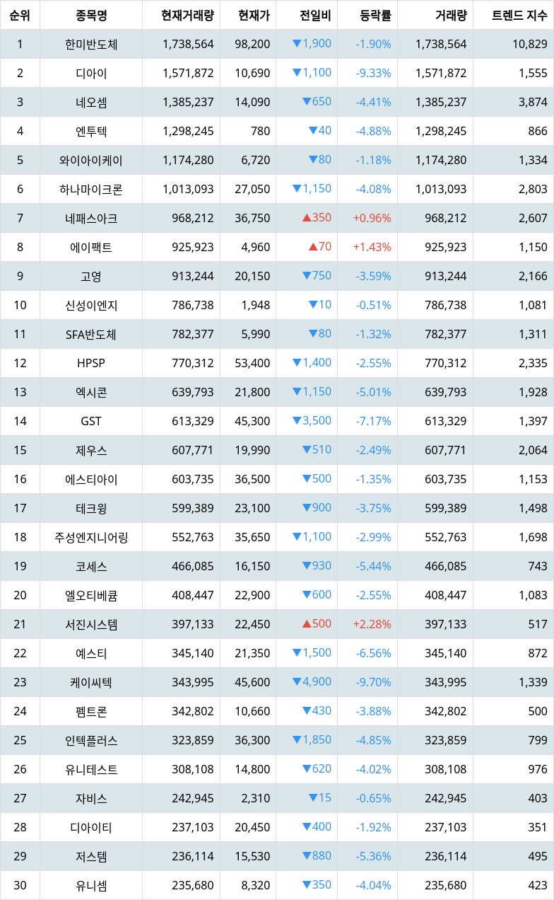 [CWN 김해남 기자] 테마별 주식 반도체 장비 현재 거래량 기준 1위는 한미반도체 주가이다. 전일 100,100원 대비 1,900원 하락해 98,200원이다. 전일대비 등락률은 -1.90%이며 거래량은 1,738,564으로 나타났다.