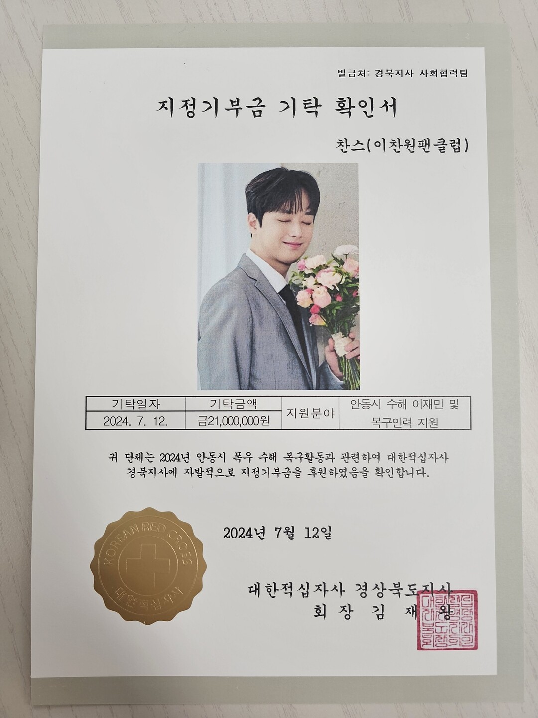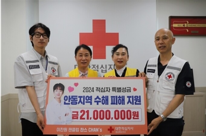 [CWN 이성호 기자] 가수 이찬원 팬클럽 '찬스'가 지난 12일 안동 지역 수해복구에 대한적십자 경북지사로 2100만0000원을 기부하며 따뜻한 마음을 전달했다고 전했다.