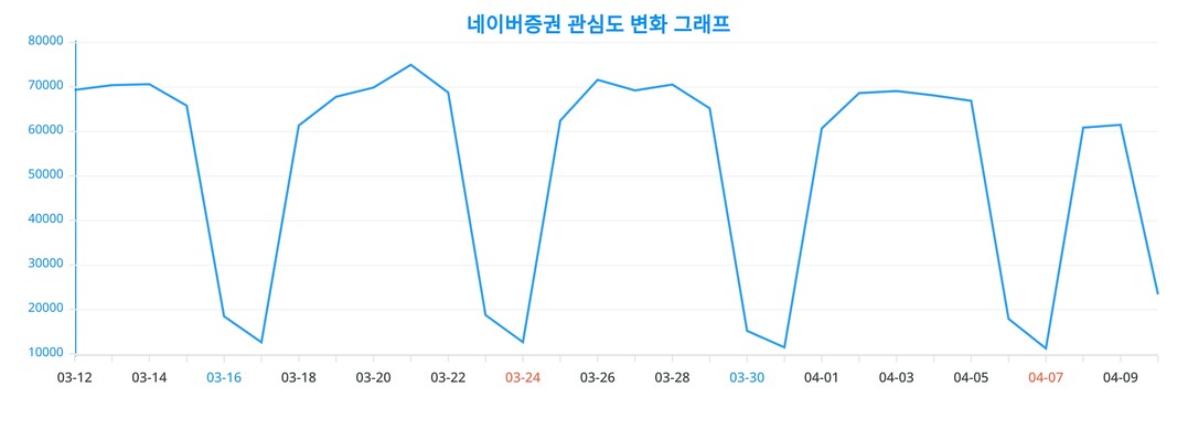 이번 분석을 통해 얻어진 네이버증권에 대한 일간 변화 추이 차트는, 네이버증권에 대한 관심이 어떻게 변화했는지를 생생하게 드러낸다.