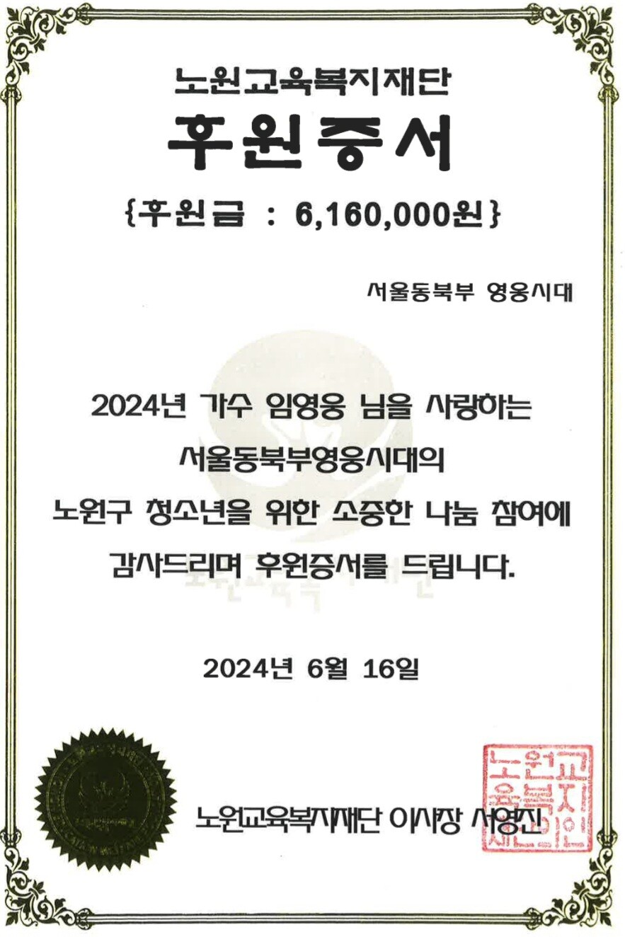 임영웅 팬클럽 '서울 동북부 영웅시대'...취약계층 청소년 616만원기부